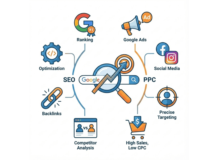 إعلانات الدفع مقابل النقرة (PPC): إدارة احترافية لإعلانات جوجل (Google Ads) وحملات التواصل الاجتماعي (فيسبوك، إنستجرام) لاستهداف جمهورك بدقة وتحقيق أعلى مبيعات بأقل تكلفة للنقرة.