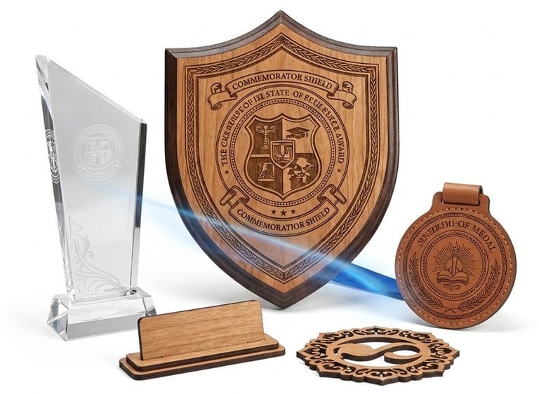 قص وحفر عالي الدقة على خامات الأكريليك والخشب والجلد لتنفيذ الدروع التذكارية، الكؤوس، الميداليات، وديكورات المكاتب الفريدة.
